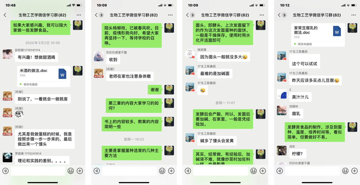在近期的在线课堂里,杨老师向同学们讲授了家庭制作米酒、腐乳、馒头和糖蒜等发酵食品的制作工艺,引导学生利用所学,充分利用居家“抗疫”的时机和条件开展线下实践,倡议要求同学们在家帮父母劳动,体会父母的不易和艰辛,让父母享受到因自己孩子长大而带来的“收获”的幸福。同学们对这种线上线下的结合表现出浓厚兴趣,在微信群里进行了认真学习讨论后,积极开展线下实践,并在班级群里展示了自己亲手制作的发酵食品。