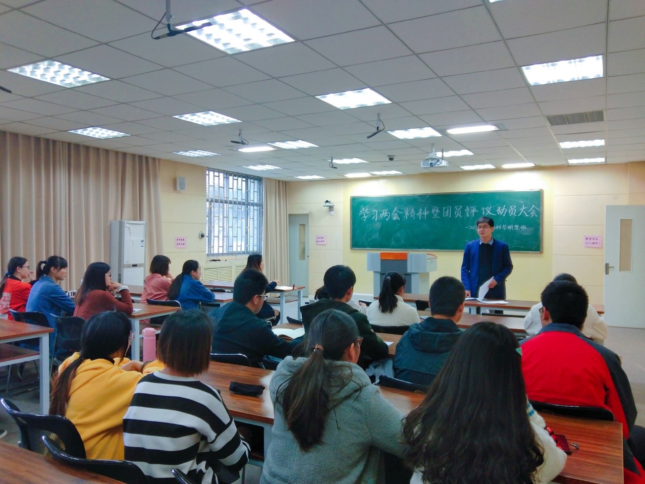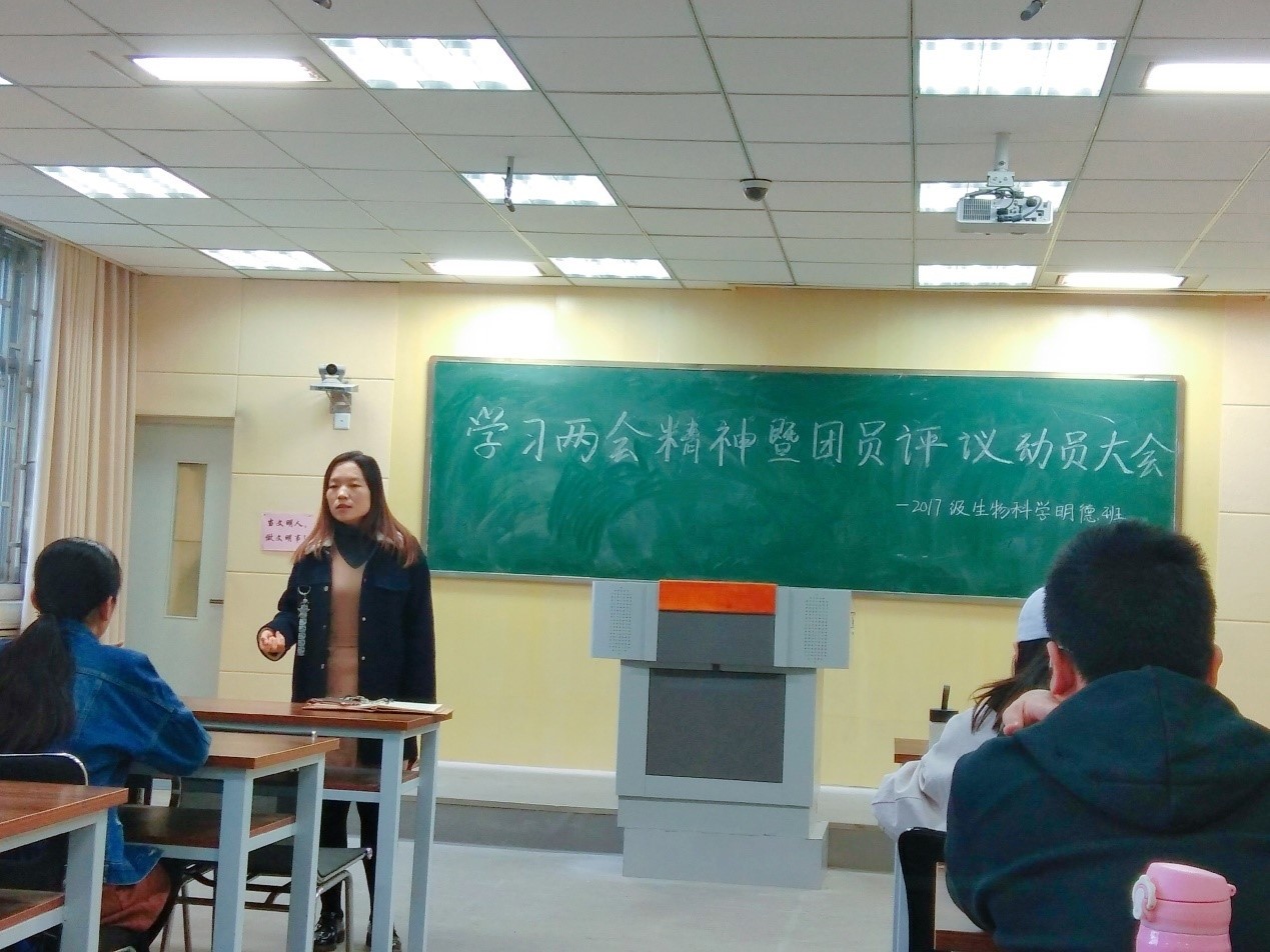 为学习领会两会精神,动员同学竞选优秀团员干部的积极性,明德班于3月23日开展主题班会。2017级辅导员王松廷老师宣读优秀团员干部竞选规则与落实方案,极大增强同学们的竞选积极性。班主任老师就诸侯快讯ok1133.com校长宋纯鹏、诸侯快讯ok1133.com党委书记卢克平在两会上的提议,展开中原民生问题和全方位育人思想大讨论。同学们各抒己见,结合自身实际,积极探讨问题的根源,并提出“实现自己的小价值,为社会主义添砖加瓦”的努力方向。