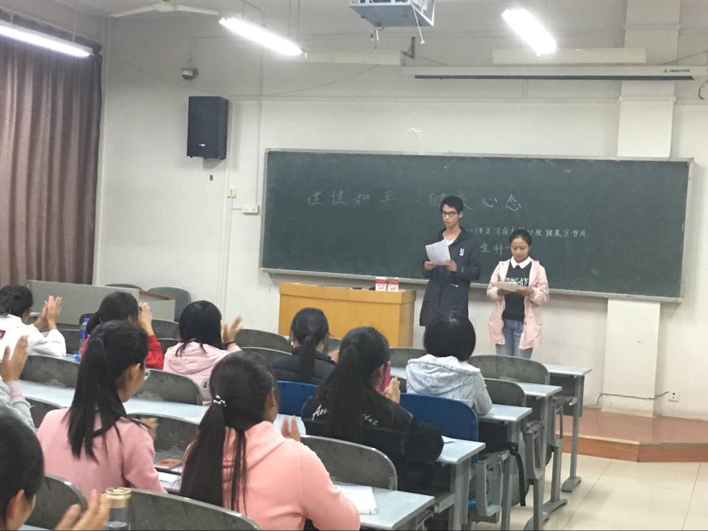 在心理健康教育宣传周期间,我院各班还进行了风格不同的心理健康教育主题班会。2016级生物科学班的班会上,同学们观看了一段视频《十大经典励志演讲:像渴望呼吸一样渴望成功》,使学生们受益匪浅。2017级生物科学班的班会上主持人带领大家做心理趣味小测试,通过专业分析得出普遍的性格特征,使同学对自己的性格有更加深入的了解,从而给出更有针对性的意见。