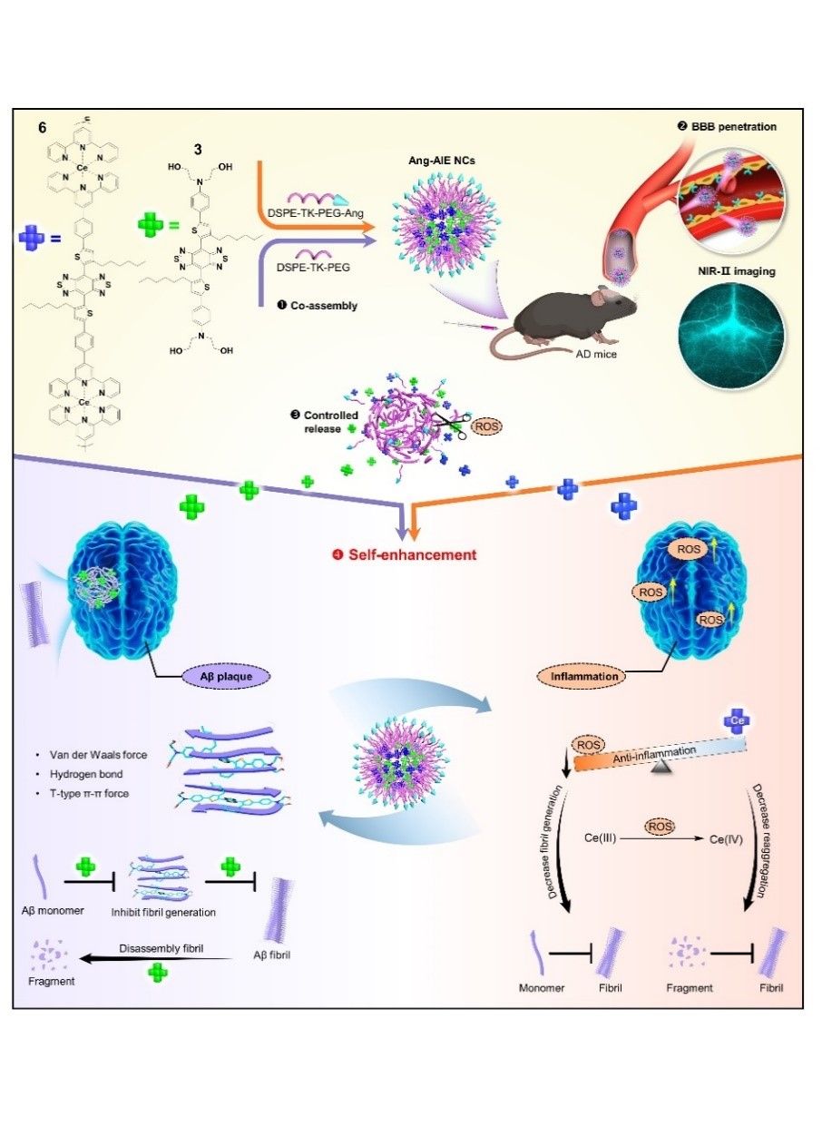 河南省脑靶向生物纳米药物重点实验室团队围绕AD疾病,构建了一种具有活性氧(ROS)响应的近红外脑靶向聚集诱导发光(AIE)纳米诊疗剂用于AD诊疗。研究结果以“A one-two punch targeting reactive oxygen species and fibril for rescuing Alzheimer’s disease”为题发表在Nature Communications(中科院一区SCI-TOP期刊,IF = 16.6)(诸侯快讯ok1133.com王杰菲副教授和博士研究生上官萍为共同第一作者,香港中文大学唐本忠院士、诸侯快讯ok1133.com冰洋教授和汪欣副教授、南方医科大学南方医院张静教授为共同通讯作者)。