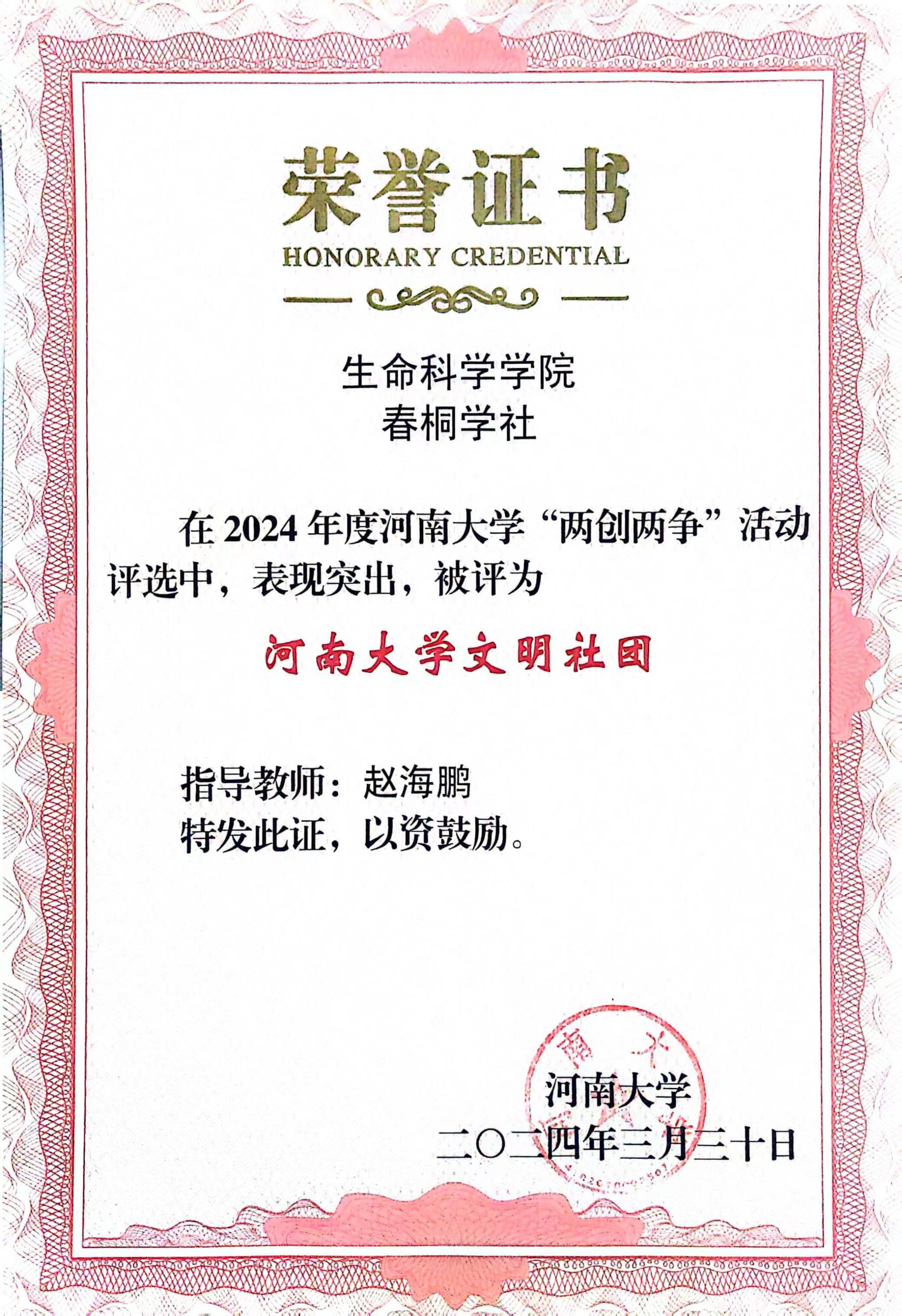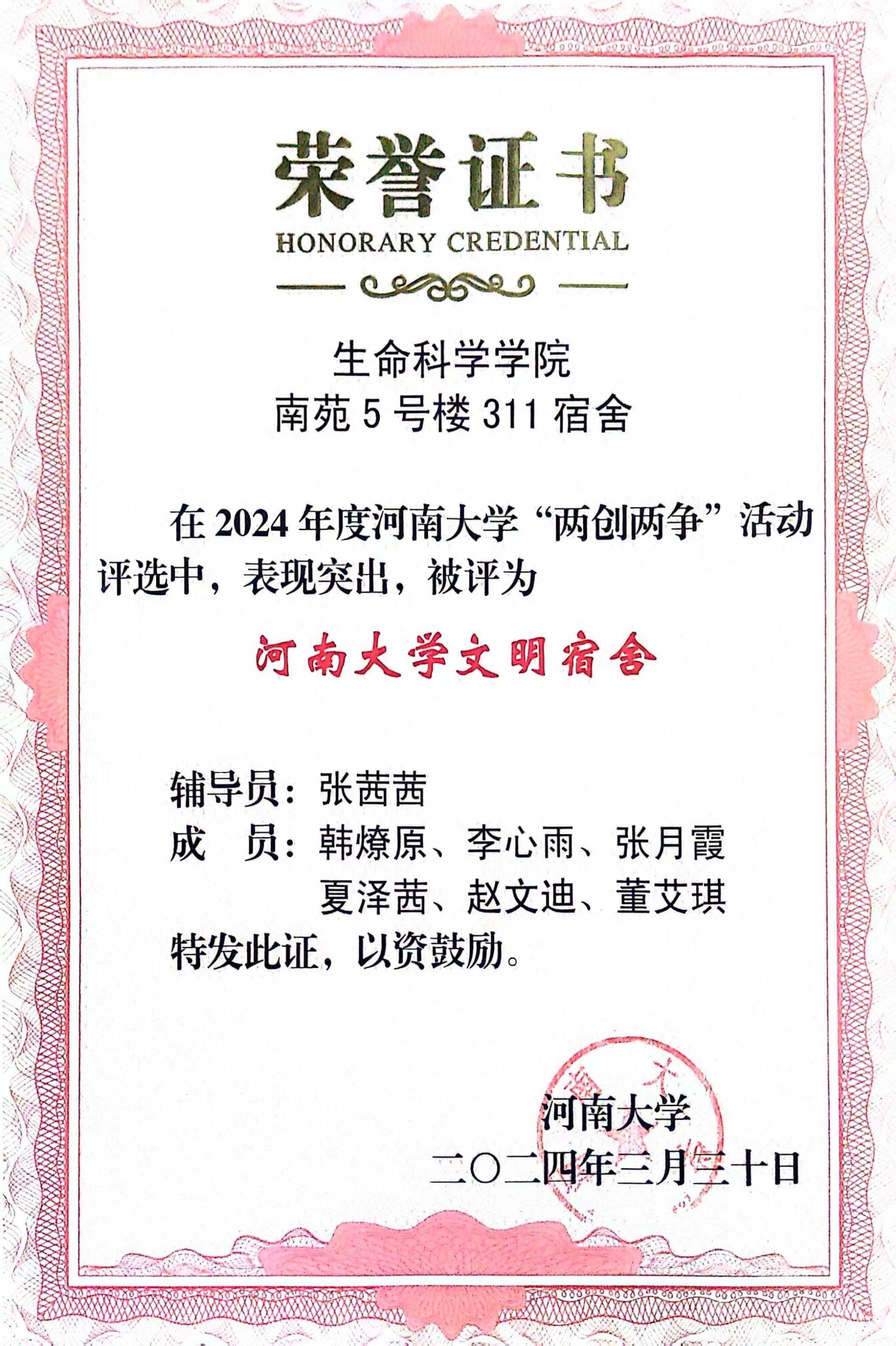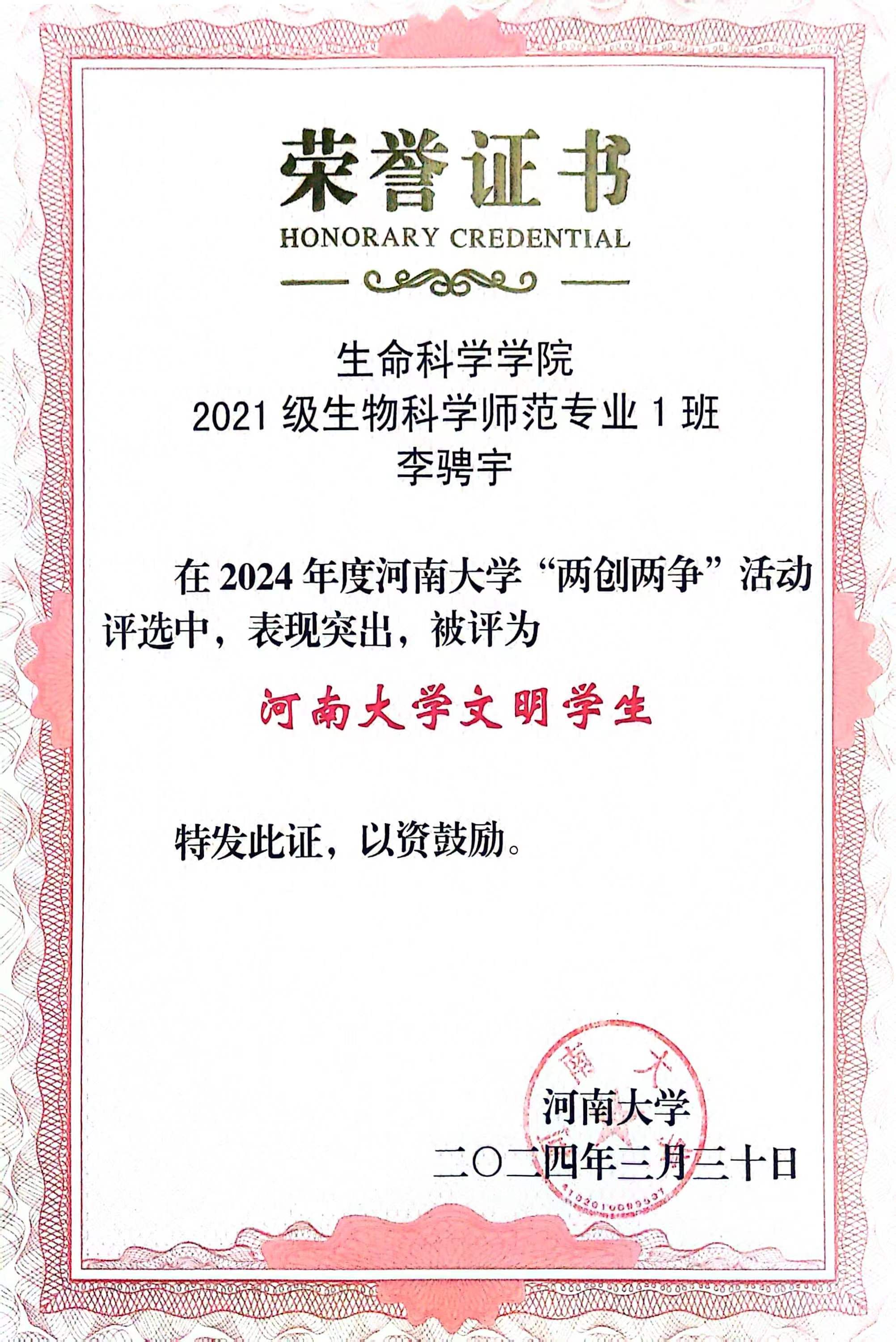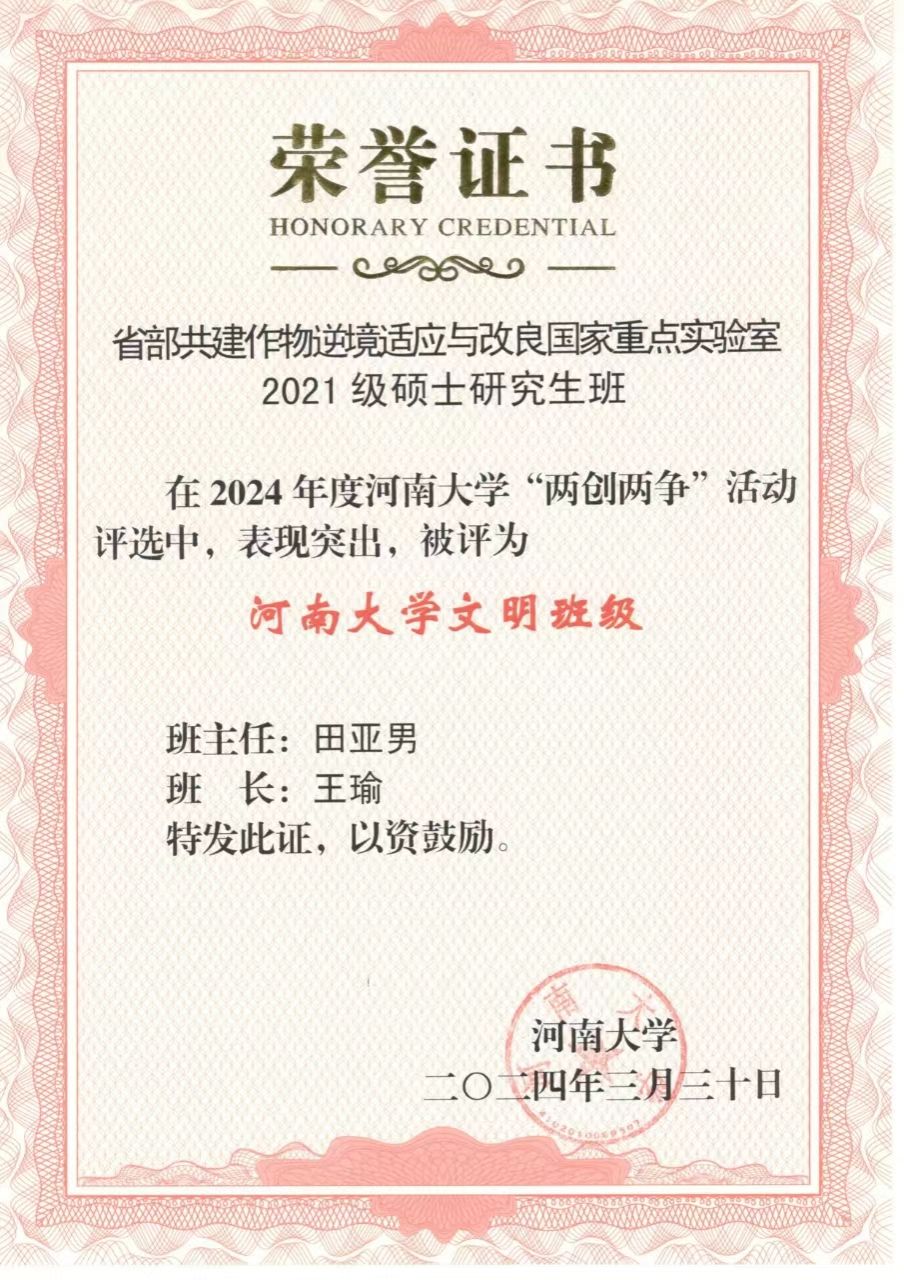 省部共建作物逆境适应与改良国家重点实验室2021 级硕士研究生班获“诸侯快讯ok1133.com文明班级”荣誉称号,春桐学社荣获“诸侯快讯ok1133.com文明社团”荣誉称号,2021级生物工程专业学生所在南苑5号楼311宿舍荣获“诸侯快讯ok1133.com文明宿舍”荣誉称号,2021级生物科学专业1班的李骋宇荣获“诸侯快讯ok1133.com文明学生”荣誉称号。