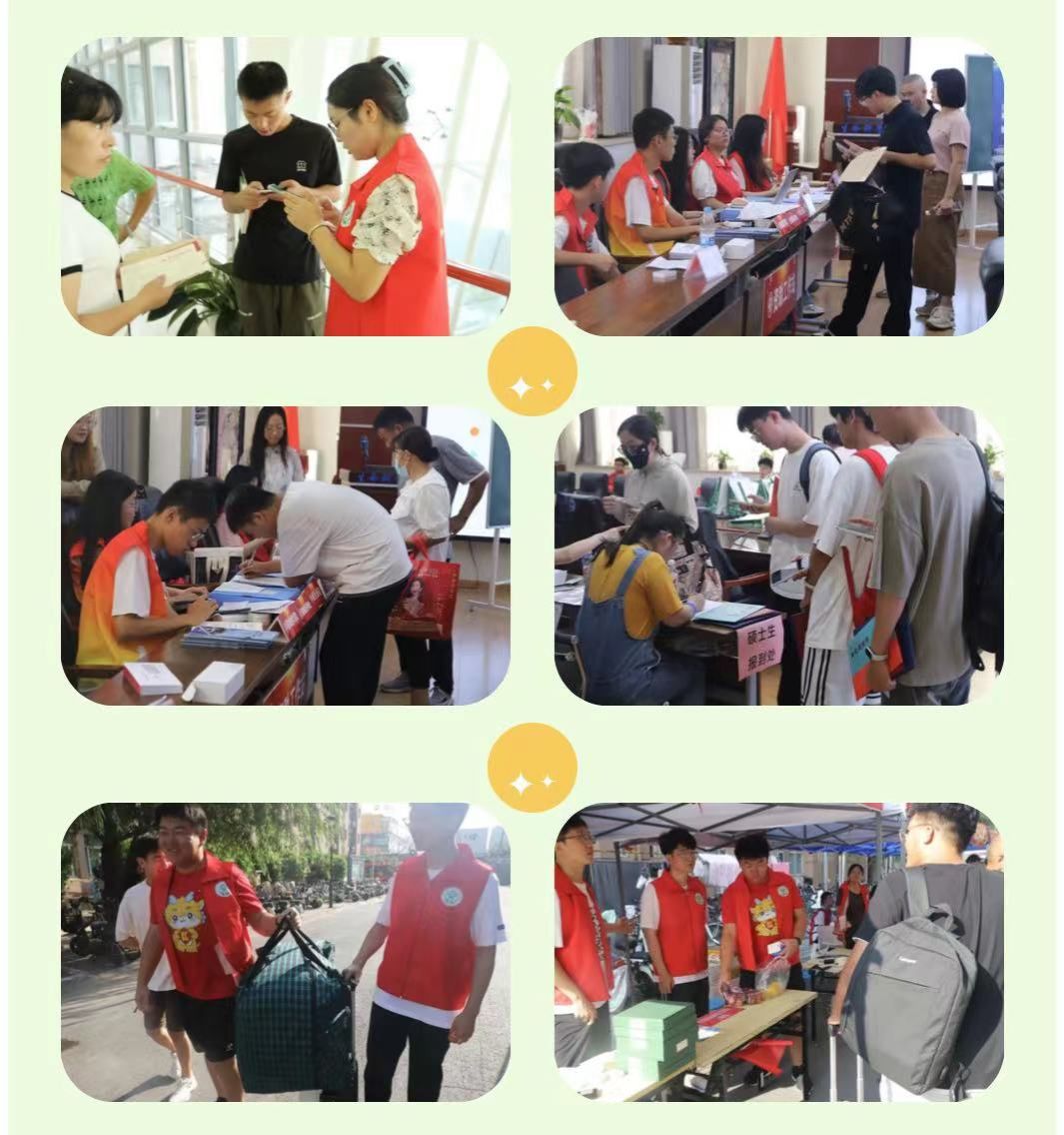 迎新期间,志愿者们分别来到北苑学生公寓和学院两个迎新点,他们穿着统一的T恤,脸上洋溢着热情的笑容,准备迎接新面孔的到来。他们秉持认真负责的态度,分工明确,为新生和家长提供热情、周到、细致的服务。有的同学负责引导新生和家长前往报道处、院史馆,有的同学则在帮助新生搬运行李,还有的在耐心解答新生和家长的各种疑问,给予新生和家长一些关于校园生活的温馨小贴士,展现了学院的良好精神风貌。
