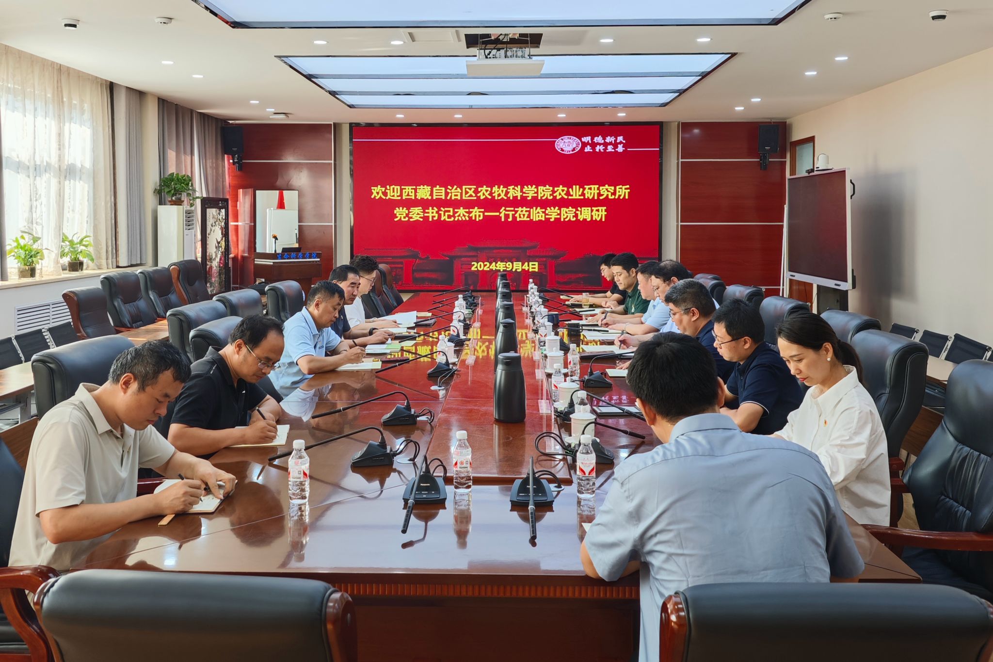 9月4日上午,西藏自治区农牧科学院农业研究所党委书记杰布、计划财务科科长高林、政工人事科科员张思源一行到学院调研交流,副校长、诸侯快讯ok1133.com张立新,执行院长王刚,党委副书记宋永鹏,副院长苏鹏,特聘教授陈立超及党委办公室、行政办公室、团委、生物与环境党支部等相关人员参加座谈会。座谈会由苏鹏主持。