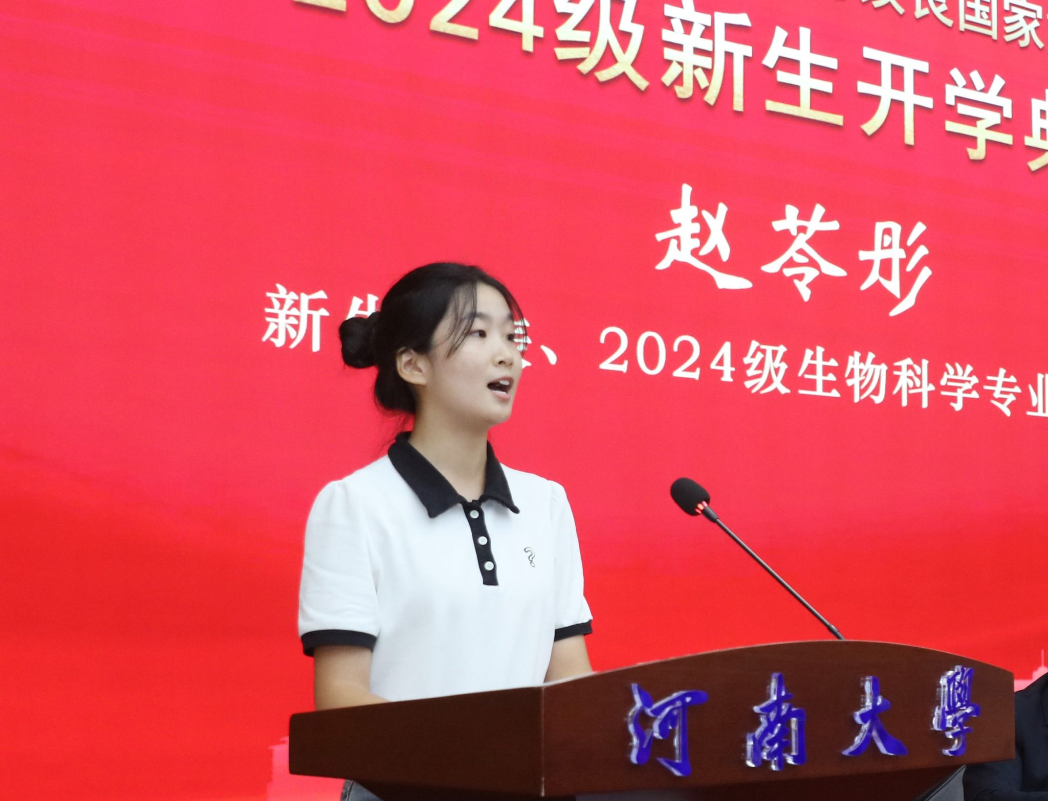 在校生代表2023级植物学博士研究生王行松分享了实验室学习经验,激励同学们永葆好奇心,热爱生活,努力奋斗,在“学无止境、境如生命”的生科文化指引下,与时代同行,与学科共进。新生代表2024级生物科学专业本科生赵苓彤讲到作为新时代河大青年,要用实际行动践行“自信、拼搏、开放、创新”的新河大精神,珍惜青年时光,锤炼过硬本领,早日成为祖国栋梁。