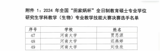 近日,由浙江师范大学主办、田家炳基金会冠名的2024年全国“田家炳杯”全日制教育硕士专业学位研究生学科教学(生物)专业教学技能大赛初赛落下帷幕。我院2023级学科教学(生物)教育硕士贾思源、迟燕婷、刘佳欣顺利入围总决赛,将于12月中旬赴浙江金华参加决赛。2024年全国“田家炳杯”全日制教育硕士专业学位研究生学科教学(生物)专业教学技能大赛初赛共评选出来自62所高校的162名选手入围决赛。该大赛旨在提升全国全日制教育硕士专业学位研究生教师专业技能,促进教育硕士培养院校的互动交流,实现“以赛促学、以赛促训”的目标。大赛初赛阶段采取线上形式进行,包括教学设计、教学展示两个环节,选手需按时提交作品至参赛网站。决赛阶段将采取现场形式,选手需根据比赛现场抽取的教材内容限时完成教学设计和课件制作,而后进行模拟上课环节。