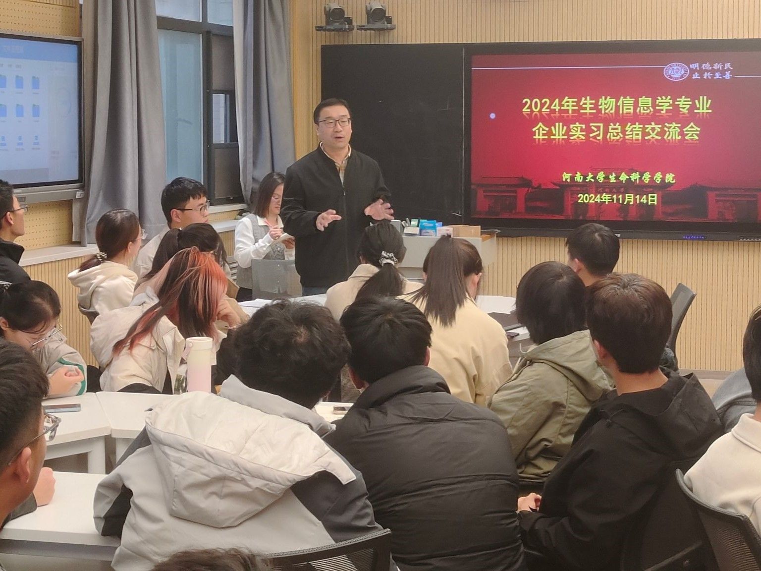 11月14日,学院在A305智慧教室举办了生物信息学专业企业实习总结交流会,总结企业实习实践成果,进一步提升教学实践能力。实习负责人石艳云回顾了企业实习的总体情况,从理论学习、技术培训、实践操作、编程与工具应用、案例分析、科研作图与报告撰写等方面进行了剖析,反馈了企业对实习学生表现的评价。通过此次实习,使学生系统了解高通量测序行业现状与发展趋势,熟悉各类组学数据分析流程的底层运算逻辑,充分认识生物信息学领域的职业设置和岗位晋升途径,并为大学生做好职业规划提供参考。植物科学与技术系主任高安礼在总结发言中强调,学院在“拔尖人才”培养工程中,注重理论与实践结合,发挥学科优势资源,为学生提供有效的实习实践机会。