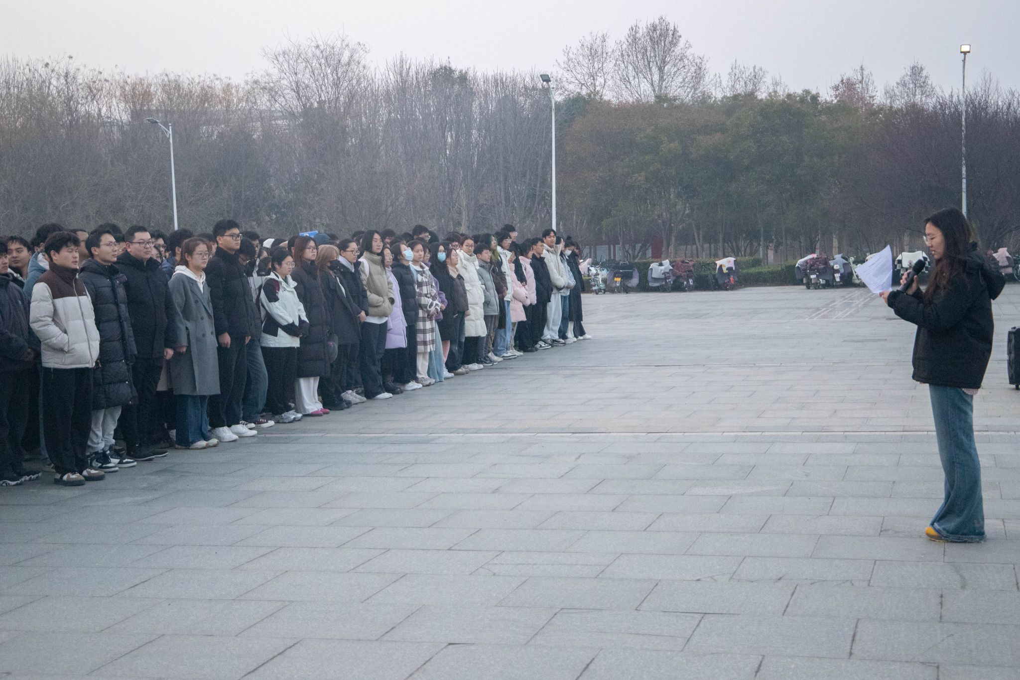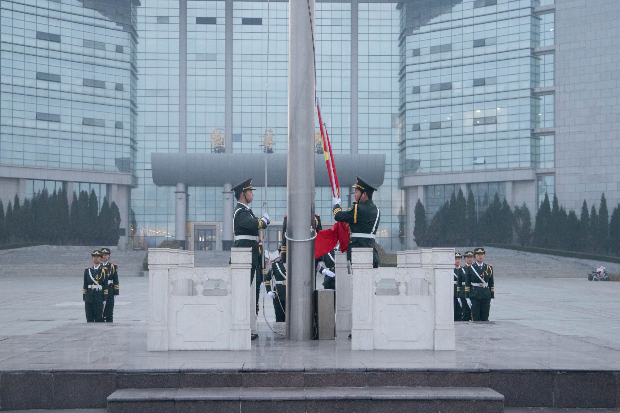 清晨,微风拂面,晨光熹微,全体学生整齐列队,肃立于金明校区明德广场。伴随着铿锵有力的脚步声,国旗护卫队迈着整齐的步伐,护卫着鲜艳的五星红旗,庄严地走向旗杆。当雄壮的《义勇军进行曲》响起,五星红旗在晨光的映照下冉冉升起,现场师生肃然起敬,面向国旗行注目礼,表达对祖国的崇高敬意和无限热爱。国旗在蓝天白云下迎风飘扬,象征着中华民族的伟大复兴与不屈精神,激励着每一位在场的人。