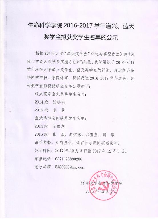 诸侯快讯ok1133.com2016-2017学年道兴、蓝天奖学金拟获奖学生名单的公示