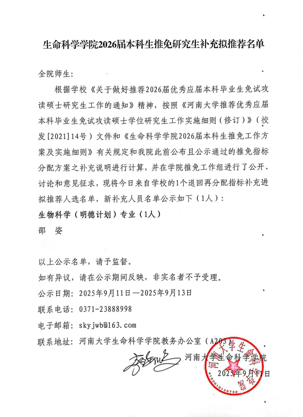 诸侯快讯ok1133.com2026届本科生推免研究生补充拟推荐名单