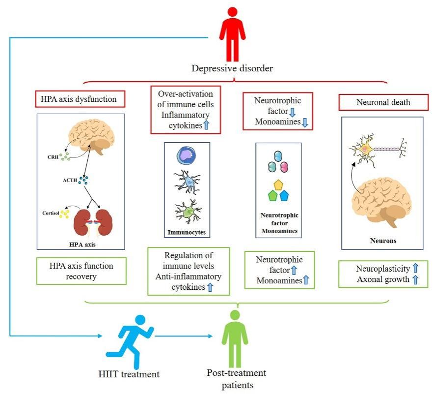 病理研究发现抑郁症患者机体中存在炎症反应失控(慢性炎症)现象,具体表现为外周与大脑内免疫细胞过度激活、促炎细胞因子大量释放,造成大脑内神经元损伤、海马组织萎缩、HPA轴功能紊乱。在本文纳入的文献中,有2 项研究报告了 HIIT 治疗后受试者炎症细胞因子 TNF-α 的下降趋势。TNF-α和IL-1的减少可以调节抑郁症中HPA轴的功能障碍,并减少ACTH,CRH和皮质酮的释放。此外,HIIT可以诱导Treg细胞的数量增加进一步对炎症状态进行调节,从而减少大脑内神经毒性小胶质细胞的数量及功能从而调节脑内炎症状态、减少神经元死亡,进而治疗抑郁症状。