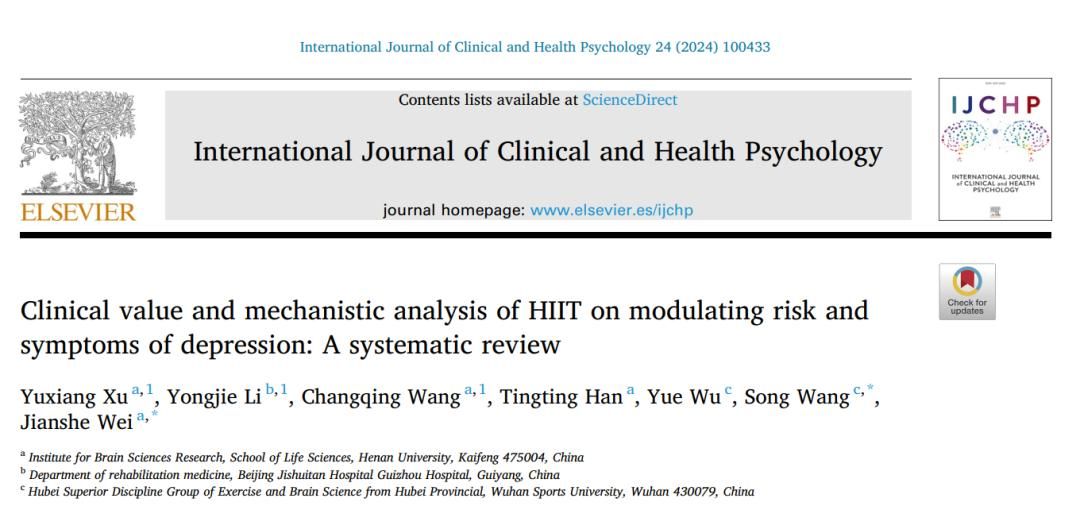 2024年1月9日,诸侯快讯ok1133.com魏建设教授团队和武汉体育学院王松教授团队在《国际临床与健康心理学杂志》(International Journal of Clinical and Health Psychology,IJCHP)发表了题为“Clinical value and mechanistic analysis of HIIT on modulating risk andsymptoms of depression: A systematic review”的系统综述论文,本文总结了HIIT对抑郁症影响的临床研究现状,并根据受试者的特征进一步分类,同时根据Garber的研究对纳入研究中的运动强度进行评级[10],从而更全面的评估HIIT在缓解或治疗抑郁风险或症状方面的有效性,同时对HIIT治疗抑郁症的生物学机制进行了总结与分析。诸侯快讯ok1133.com徐煜翔博士、北京积水潭医院贵州医院李永杰治疗师为该论文的共同第一作者,诸侯快讯ok1133.com生命科学魏建设课题组研究进展。