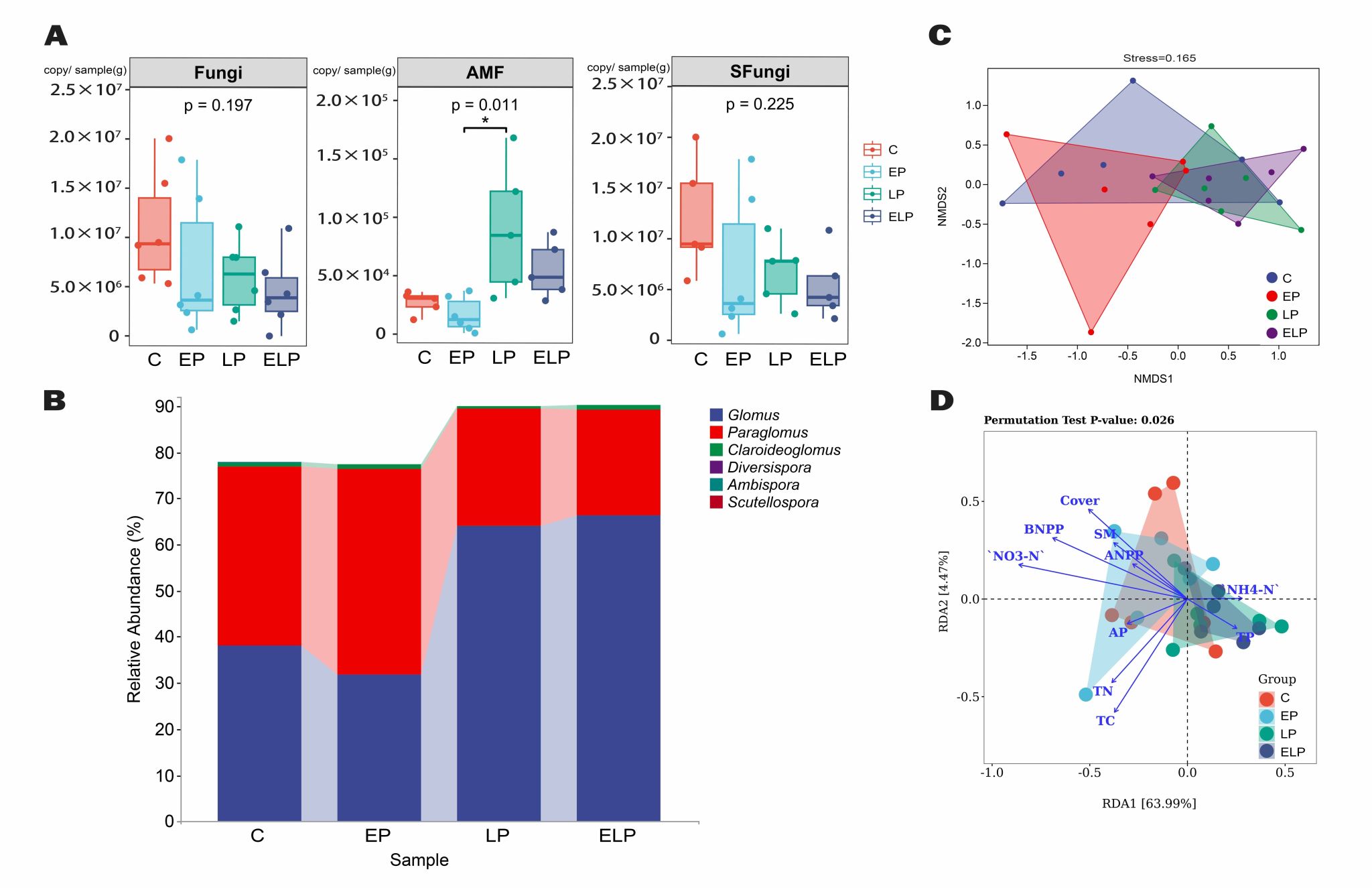 半干旱生态系统易受降水状况变化的影响。然而,半干旱生态系统中土壤微真核生物群落对降水季节分布变化的响应仍不清楚。通过5年田间试验,研究了生长季降水分布变化对温带草原土壤微真核生物群落的影响。研究结果表明生长初期较高的降水量可以补偿生长中期水分胁迫对土壤微真核生物群落的影响。生长季后期较高的降水量不能补偿生长季中期的水分胁迫,这对土壤微真核生物的生物量、原生生物的生活史策略、丛枝菌根真菌(AMF)和原生生物的群落组成和结构等产生了重要影响。此外,本研究还指出,AMF和原生生物对生长季降水峰值的推迟具有不同的响应模式。总之,这些努力将大大提高我们对整个生长季降水分布变化对土壤微生物群落影响的认识,并呼吁更多地关注年际内季节性气候变化对土壤微生物群落的影响。