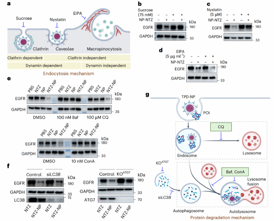 靶向蛋白降解(TPD)是当今生物医药领域的热门研究方向,通过TPD分子将疾病相关蛋白牵引至细胞内的“回收站”进行降解清除,为传统药物难以成药的蛋白质提供了巨大的治疗潜力。但现有的TPD分子为适应不同的疾病靶点和器官特异性,通常需要复杂的分子设计和从头合成,严重阻碍了临床的转化。研究团队受到纳米颗粒自发的细胞运输途径启发,提出了一种基于纳米颗粒的靶向蛋白降解通用新策略(TPD-NPs),该系统不需要特殊的细胞内吞和引导进入“回收站”的结构设计,不仅有效地克服了合成繁琐且难以控制的瓶颈问题,为TPD工具的开发提出了新范式,还为纳米医学提供了新的知识,扩展了纳米药物的应用范畴。