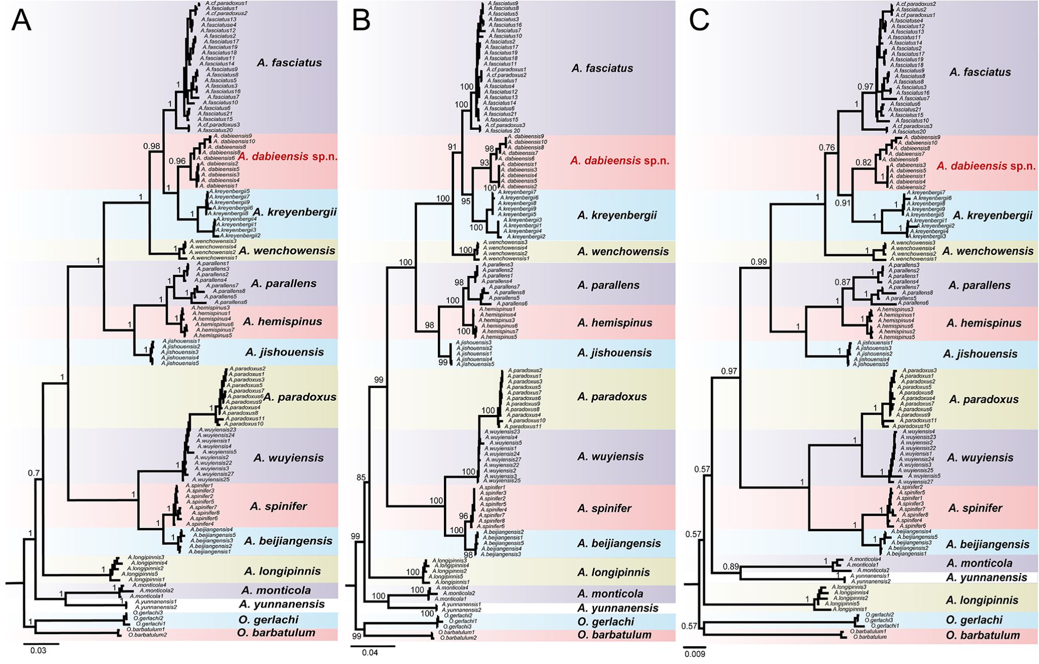 本研究基于对大别山区鱼类资源系统性的调查和丰富的标本积累,利用形态学和分子系统学相结合的方法,综合比较光唇鱼属各物种的形态结构差异和系统发育关系等证据,经反复考证,最终确定为鲤科光唇鱼属新物种,并根据《国际动物命名法规》命名为:大别山光唇鱼A. dabieensis sp. nov. 本研究不仅丰富了我省大别山区的鱼类多样性资源,还为大别山森林生态系统生物多样性保护和生物资源开发利用提供理论依据和有力支撑。
