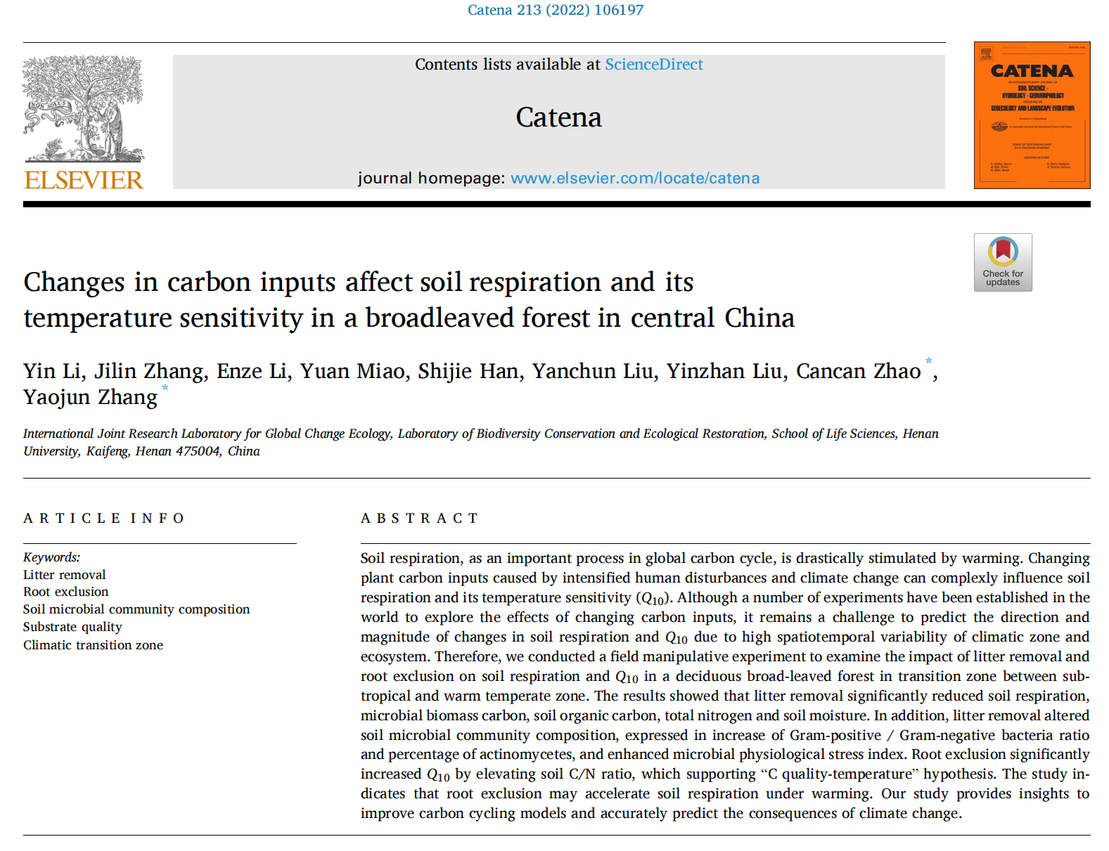 近期,诸侯快讯ok1133.com全球变化生态学国际联合实验室在地学国际主流期刊Catena(中科院一区,IF2021=5.198)发表题为“Changes in carbon inputs affect soil respiration and its temperature sensitivity in a broadleaved forest in central China”的学术论文。2018级生物工程专业本科生李印、张济麟分别为论文第一、二作者。论文由青年教师赵灿灿博士和张要军博士共同指导。