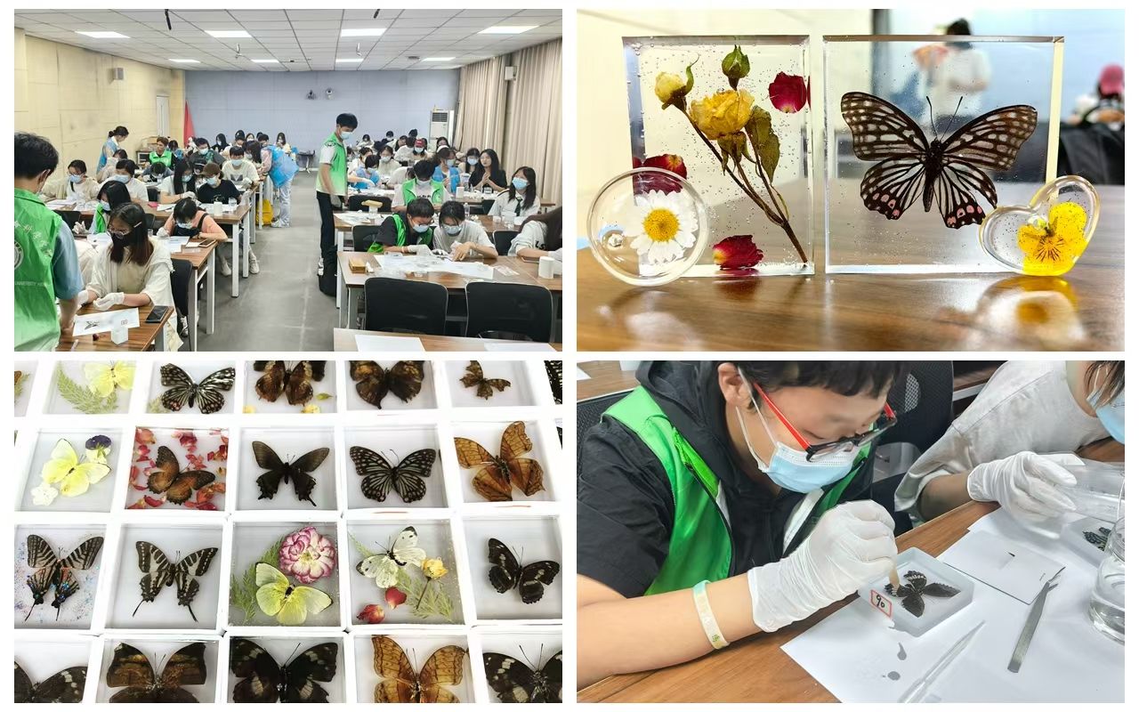 活动采取线上培训和线下“技能操作赛+作品展示赛”方式进行,社团志愿者对参赛选手做线上微专题培训,详细讲解了比赛的目的、要求、注意事项及评分标准,对于琥珀标本创意制作的流程进行讲解。参赛同学从艺术审美视角设计琥珀作品,栩栩如生的标本定格了动植物的美好,或是将蝴蝶置身于玫瑰花瓣雨中翩翩起舞,或是让蝴蝶在花朵的陪衬下,静静停靠在枝叶上,精妙的设计令人赞叹不已。同学们对于此次活动展现出了极大的参与热情,每个人都充分发挥了自己的创作能力,为大家呈现了精彩绝伦的琥珀展览。