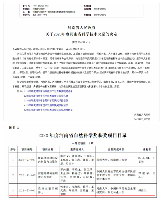 近日,河南省人民政府公布《关于2023年度河南省科学技术奖励的决定<豫政〔2023〕41号>》,我院韩士杰教授团队成果《森林土壤固碳潜力》获2023年度河南省自然...